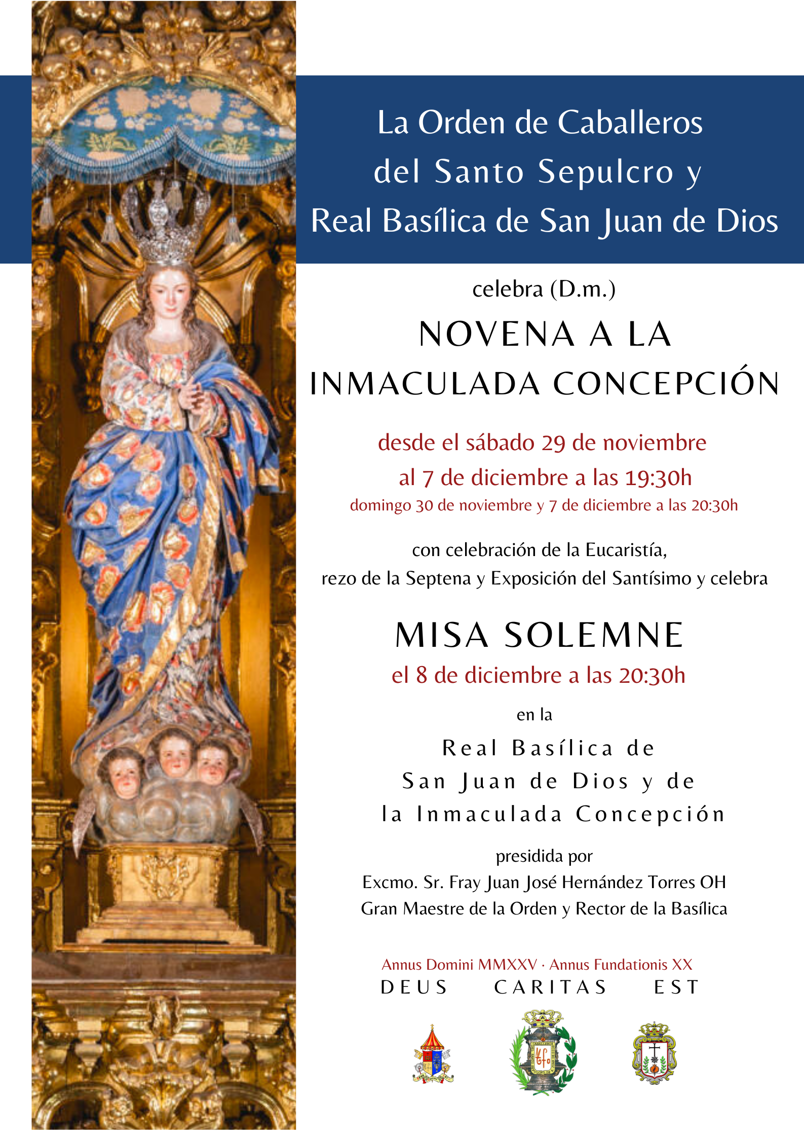 La Orden de Caballeros del Santo Sepulcro y Real Basílica de San Juan de Dios celebra (D.m.) la Novena a la Inmaculada Concepción desde el sábado 29 de noviembre al 7 de diciembre a las 19:30h. (Domingo 30 de noviembre y domingo 7 de diciembre a las 20:30h) con celebración de la Eucaristía y Solemne Exposición del Santísimo Sacramento.